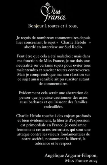 Lors de son passage sur Sud Radio, Miss France 2025, une des seules femmes noire à avoir remporté le prestigieux concours, a été confrontée à une question inattendue et politiquement lourde : « Êtes-vous Charlie ? ».